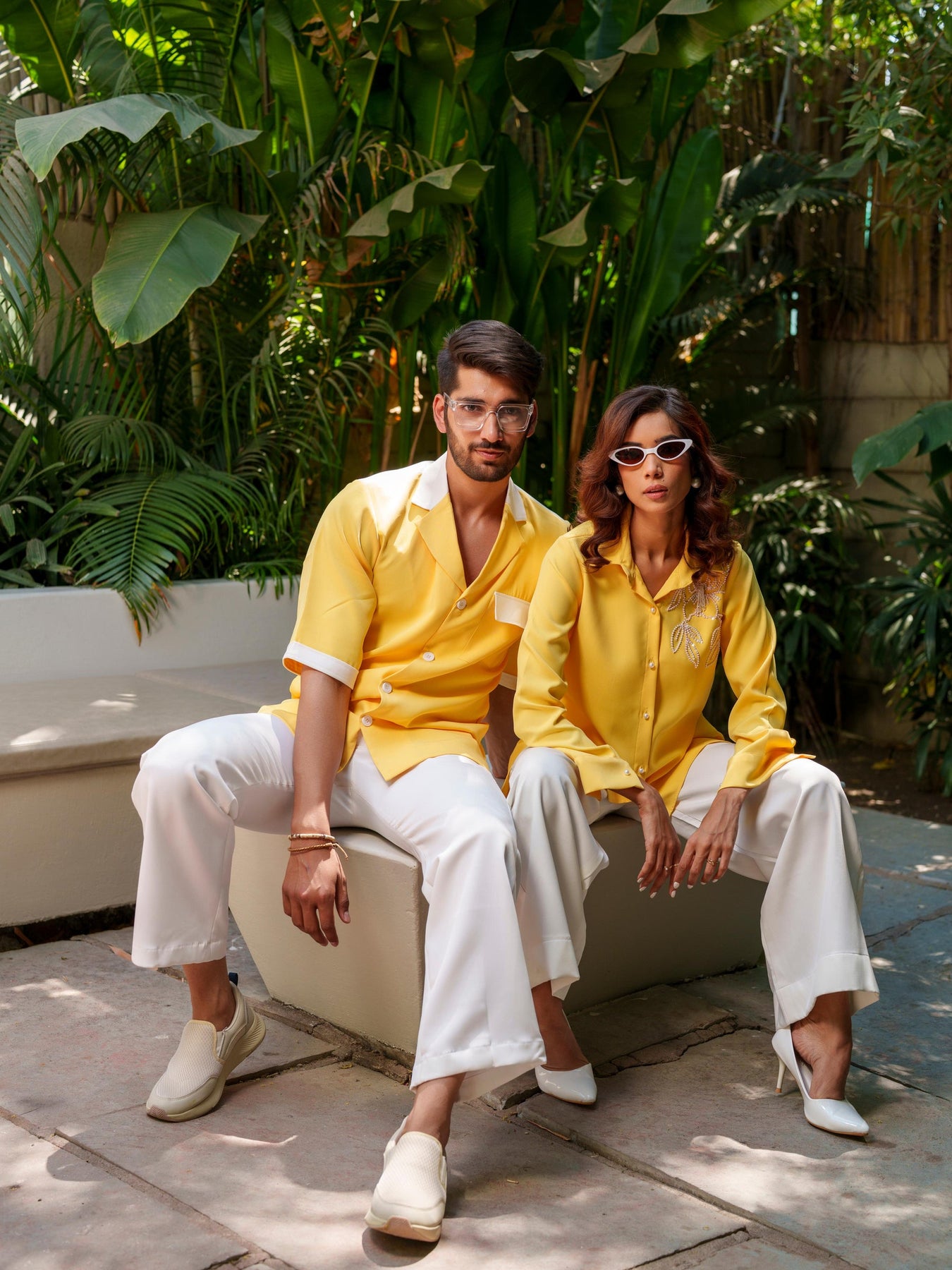 Experience luxury and sophistication with our Lucas & Ambrose couple shirt set. This elegant and exclusive set features a hand-embroidered women's shirt and a color-block men's shirt, both made with premium banana crape fabric. Perfect for couples looking to make a statement with coordinated style.